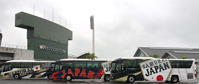 強化合宿期間中、宮崎交通株式会社及び宮崎県、宮崎市の協力で、侍ジャパン仕様にデザインされたラッピングバス(計3台)でチームの送迎を行います。車両デザインは、《ホームユニホーム柄、ビジターユニホーム柄、ホーム+ビジターユニホームのミックス柄》の3種類です。詳細は宮崎交通株式会社の公式サイトをご確認ください。