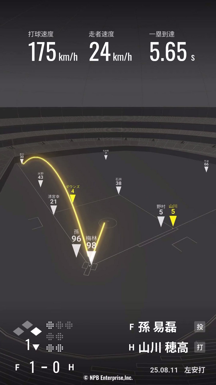 今まで見えなかったプレーが見える!打球の軌道、守備の動き、投球の回転数まで、従来の速報では得られなかった詳細データをリアルタイムで表示。