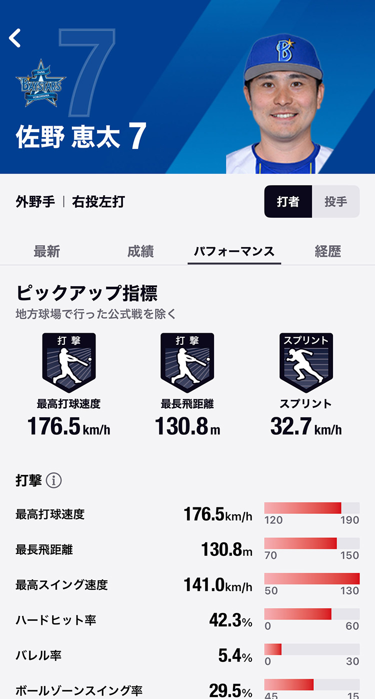 当日の出場成績をはじめ、月別今シーズン成績やファンならすぐに確認したい成績情報はもちろん、これまで見ることができなかったホームランの軌道や打球速度、投球の回転数などHawk Eye Innovations(ホークアイ)に基づくトラッキングデータを搭載!