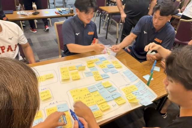 直前合宿初日の夜、ホテルでのミーティングではあるテーマについて自由な発想でアイデアや意見を出し合う「ブレーンストーミング」が行われた。お題は「社会人野球の魅力とは」。4つのグループに分かれ各々が意見を書いた付せんが次々にテーブルに並べられていった。