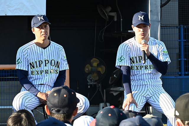 また、日本通運野球部から参加した強打の外野手・北川利生選手は「ホームランバッターに憧れてプレーしていました」と話し、今年のドラフト会議で千葉ロッテマリーンズから5位指名を受けた最速155キロ右腕の冨士隼斗投手は「子供の頃は身長が小さかったのでまずは体を大きくすることが大事だと思います」と振り返った。