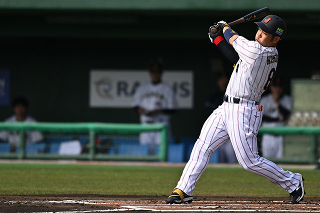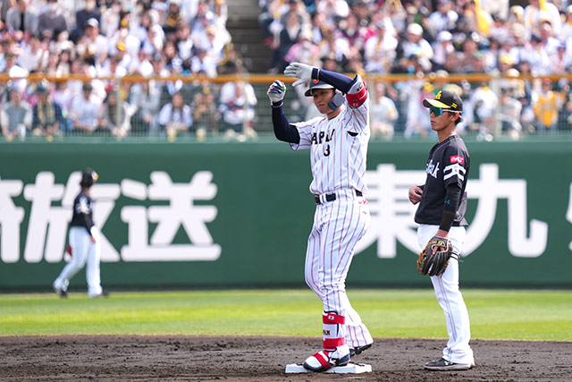 活躍目立ったのは昨年のセ・リーグ覇者である阪神勢だ。先制を許した1回裏、無死満塁から佐藤輝明(阪神)の内野安打で同点に追いつくと、続くチャンスで森下翔太(阪神)がレフトオーバーの二塁打で2点を勝ち越し。さらにこの回は源田壮亮(西武)のセンター前安打も出て4点を奪った。