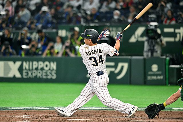 6回裏にも2死一、二塁のチャンスで得点できず。それでも嫌な流れをひと振りで払拭したのが、絶好調の4番・吉田正尚(レッドソックス)だ。 7回裏、2死一塁の場面でジョン・ケネディのインコース低めのスライダーを鮮やかに振り抜くと、打球は右中間スタンドに飛び込む逆転2ラン。スタンドもベンチも大熱狂に導く一発で逆転に成功した。